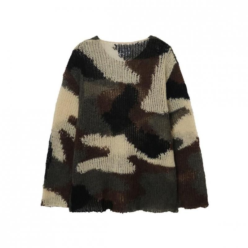カモフラージュパターンの迫力を程よく中和し、バランスの取れた一枚に。個性的でありながらどんなスタイルにも馴染む万能なニット。